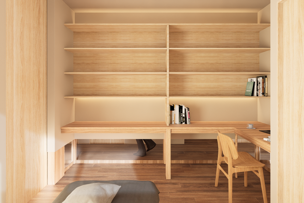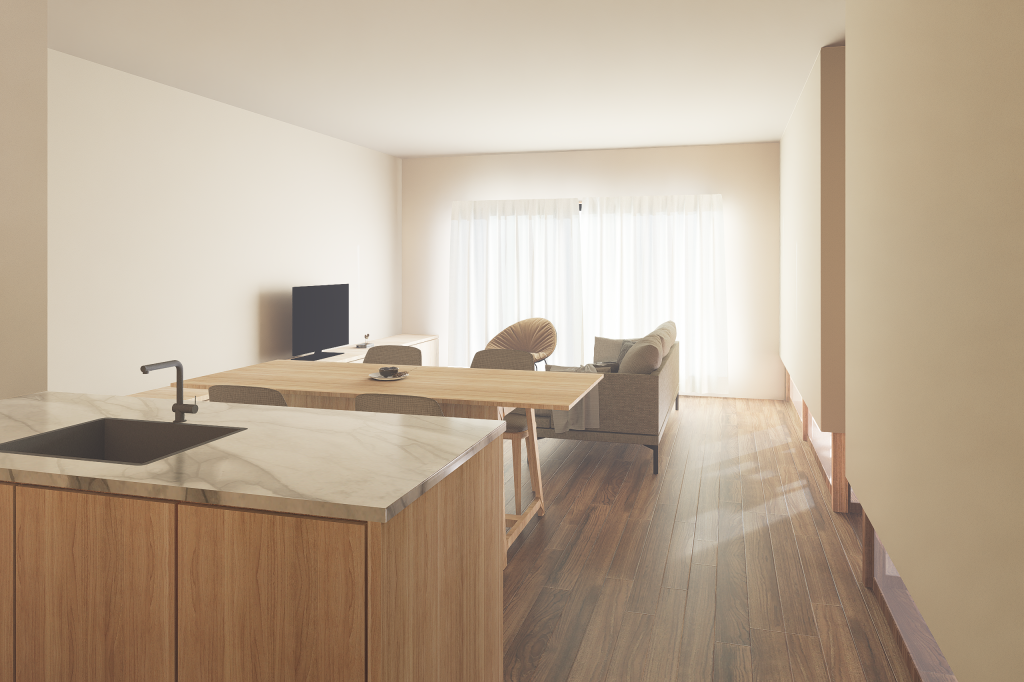 間仕切りの位置を変えずになるべく残しつつ足元に開口を設けることで、コストを抑えながら繋がりを感じる空間となるようにしました。