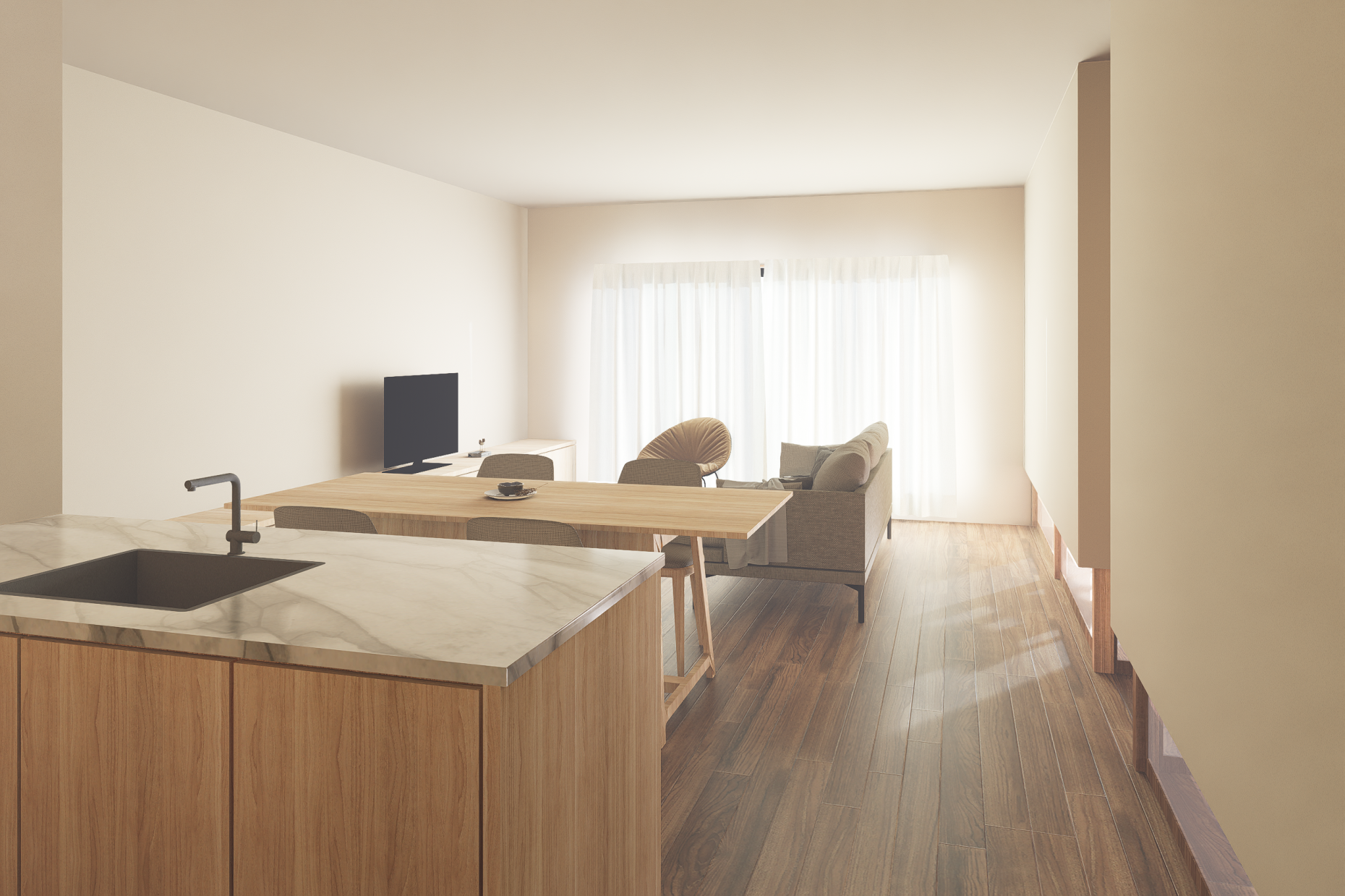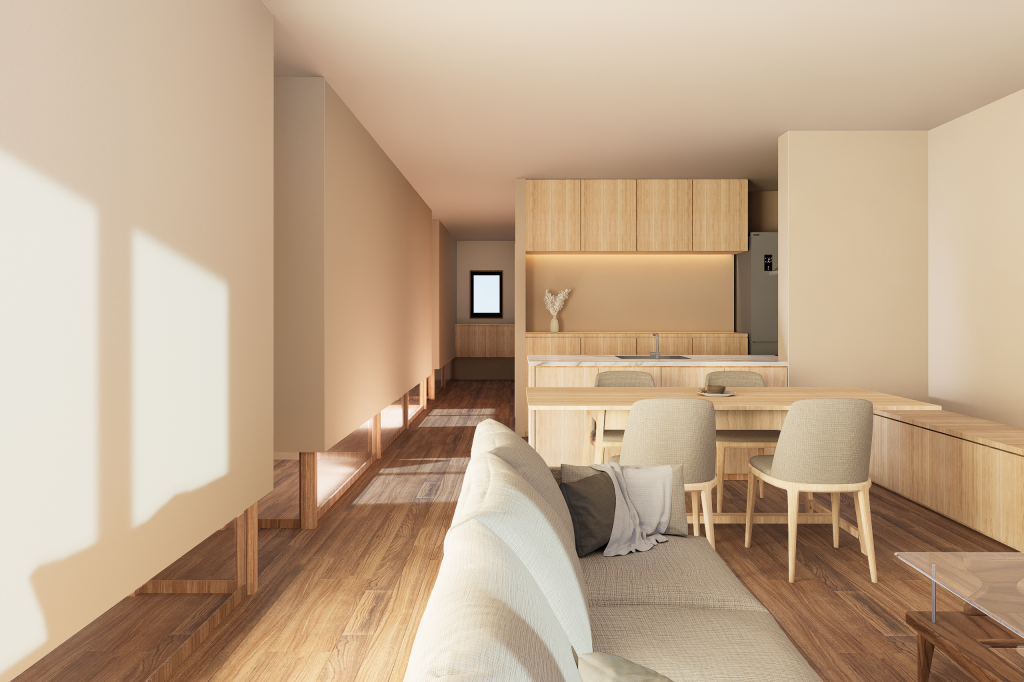 仕切りつつも、繋がった一つの空間のように感じられる、4人家族の住まいを計画しました。