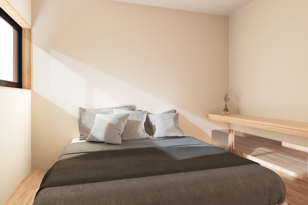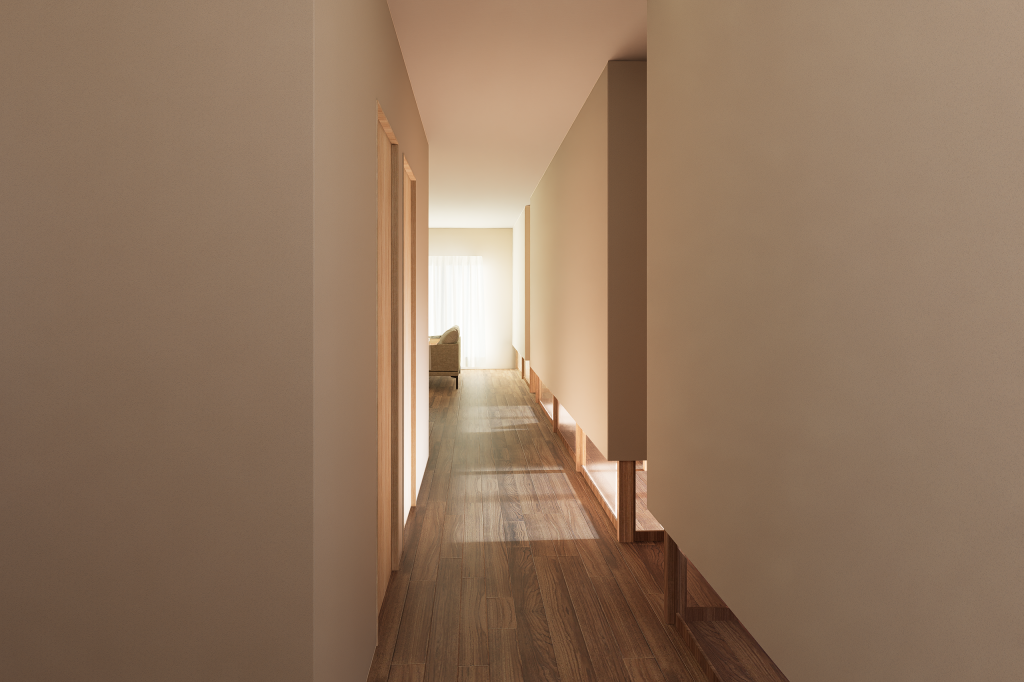 各寝室はそれぞれ分かれていますが、各寝室と廊下・リビングの間に設けた地窓から光が広がり、暗いただの通路だった廊下を家族の存在を感じられる明るい廊下に変え、キッチンもリビングに開くことで、すべての居室が孤立しないようにしています。